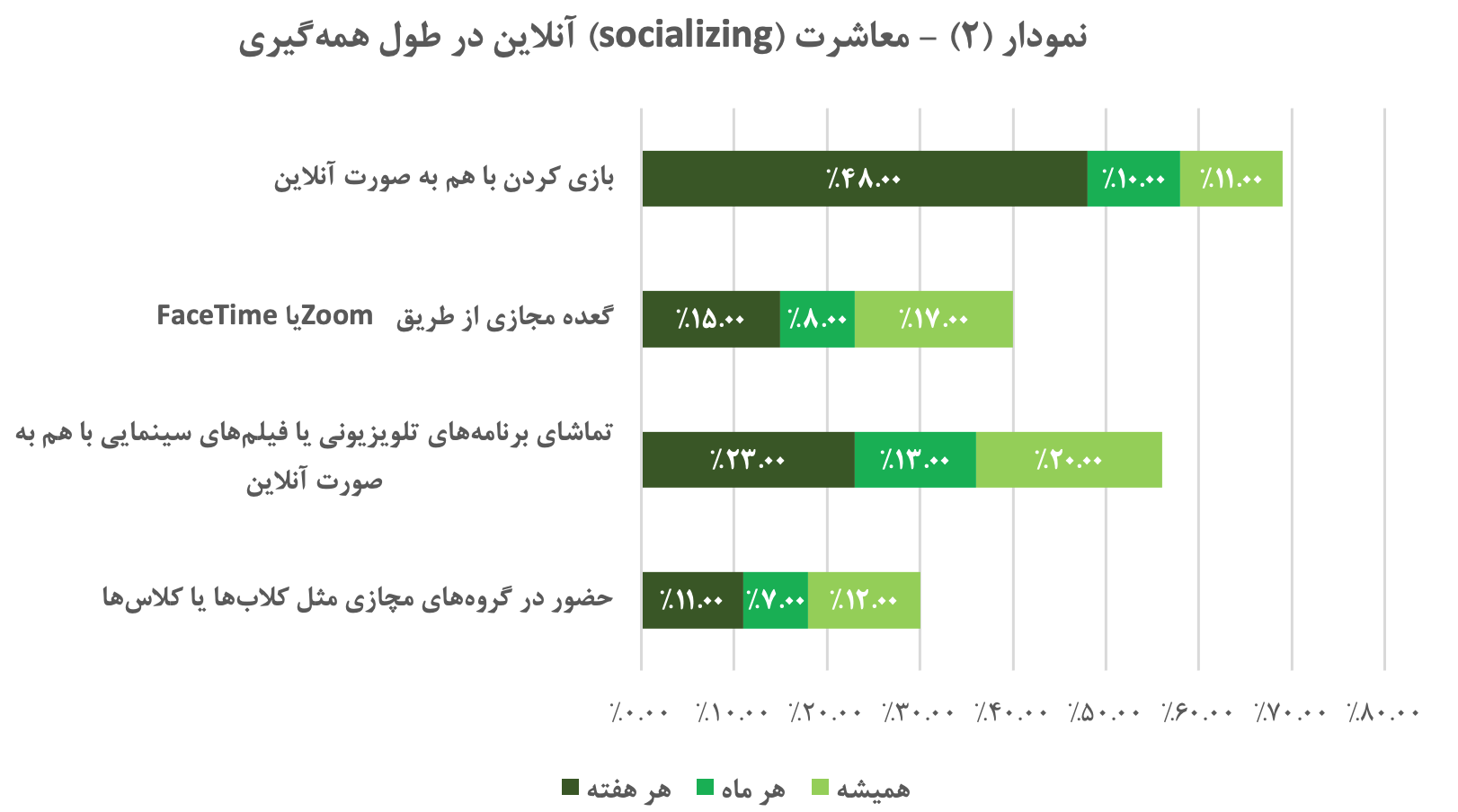 هفتاد درصد از همه نوجوانان 8 تا 18 ساله با بازیهای ویدیویی آنلاین با دوستان خود معاشرت میکردند، از جمله نزدیک به نیمی (48 درصد) که حداقل یک بار در هفته این کار را انجام میدادند (نمودار 2 را ببینید). نیمی از آنها (56 درصد) از طریق برنامههای ویدیویی مانند زوم (Zoom) یا فیستایم (FaceTime) با گروهی از دوستانشان وقت میگذرانند که در این بین تقریباً از هر چهار نفر یک نفر (23 درصد) گفته اند حداقل هفتهای یک بار این کار را انجام میدهند. و 40 درصد از جوانان در مهمانیهای تماشای ویدیوی آنلاین (watch party – گروهی از مردم در مکانهای مختلف، همگی یک فیلم یا برنامه تلویزیونی را همزمان با هم تماشا میکنند) با دوستانشان شرکت کردند، و از پلتفرمی مانند Hulu Watch Party استفاده میکنند. از هر هفت نفر یک نفر (15%) گفتهاند که حداقل هر هفته این کار را انجام میدهند. تعداد کمتری (29 درصد) در فعالیتهای آنلاین زنده مانند باشگاههای کتاب یا کلاسهای غیرمرتبط با مدرسه (مانند کلاس آشپزی یا یوگا) شرکت کردهاند که در این بین حدود یک نفر از هر 10 نفر (11 درصد) هر هفته این کار را انجام میدادهاند.