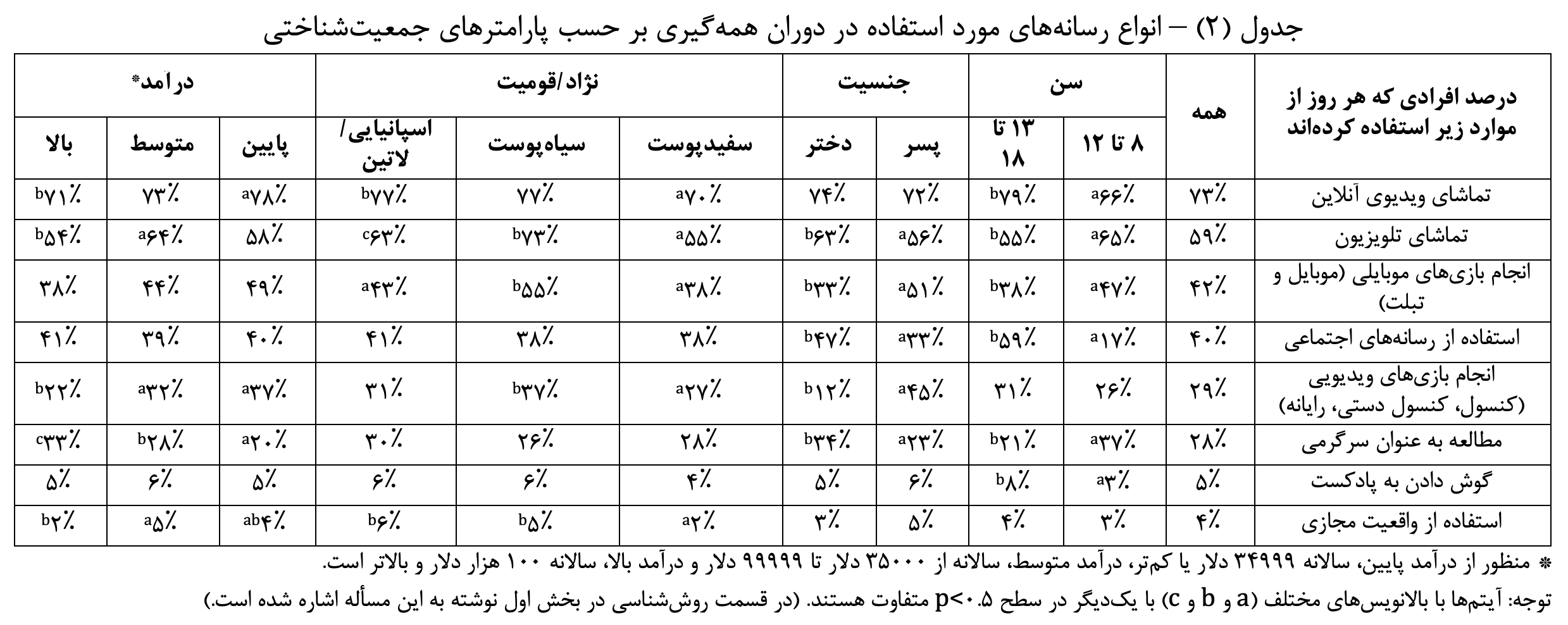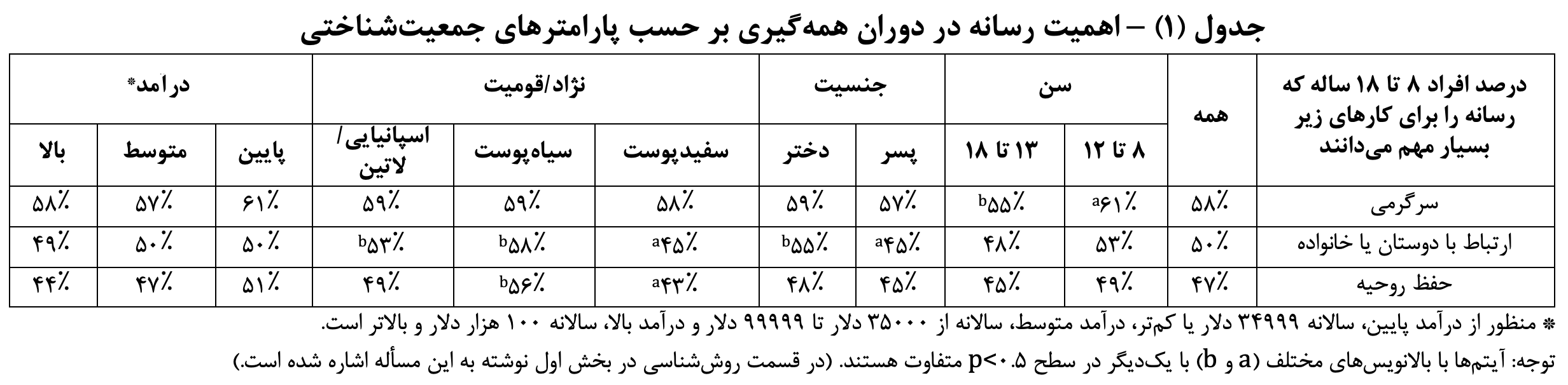 اهمیت رسانه در تمام گروههای سنی، نژادها، سطح درآمد و در بین پسران و دختران بالا بود. نونهالان (8 تا 12 ساله) بیشتر از نوجوانان (13 تا 18 ساله) میگویند که رسانهها برای تفریح در طول همهگیری “بسیار” مهم هستند (61 درصد در مقابل 55 درصد)؛ شاید به این دلیل که گزینههای آنها نسبت به بچههای بزرگتر خیلی محدودتر است. جنبههای اجتماعی رسانهها در طول همهگیری برای دختران مهمتر از پسران بود، به طوری که 55 درصد دختران در مقایسه با ۴۵ درصد پسران گفتند رسانهها برای برقراری ارتباط با دوستان و خانواده “بسیار” مهم هستند. جوانان سیاهپوست بیشتر از بقیه به اهمیت رسانهها برای حفظ روحیه خود در طول همهگیری اشاره کردند (56 درصد در مقابل ۴۳ درصد برای سفیدپوستان و ۴۹ درصد برای افراد اسپانیایی/لاتین)، و جوانان سیاهپوست و اسپانیاییتبار/لاتین نسبت به همتایان سفیدپوستشان احتمال بیشتری دارد که بگویند رسانه برای برقراری ارتباط “بسیار” مهم است (به ترتیب 58 درصد و 53 درصد در مقایسه با 45 درصد سفیدپوستان).