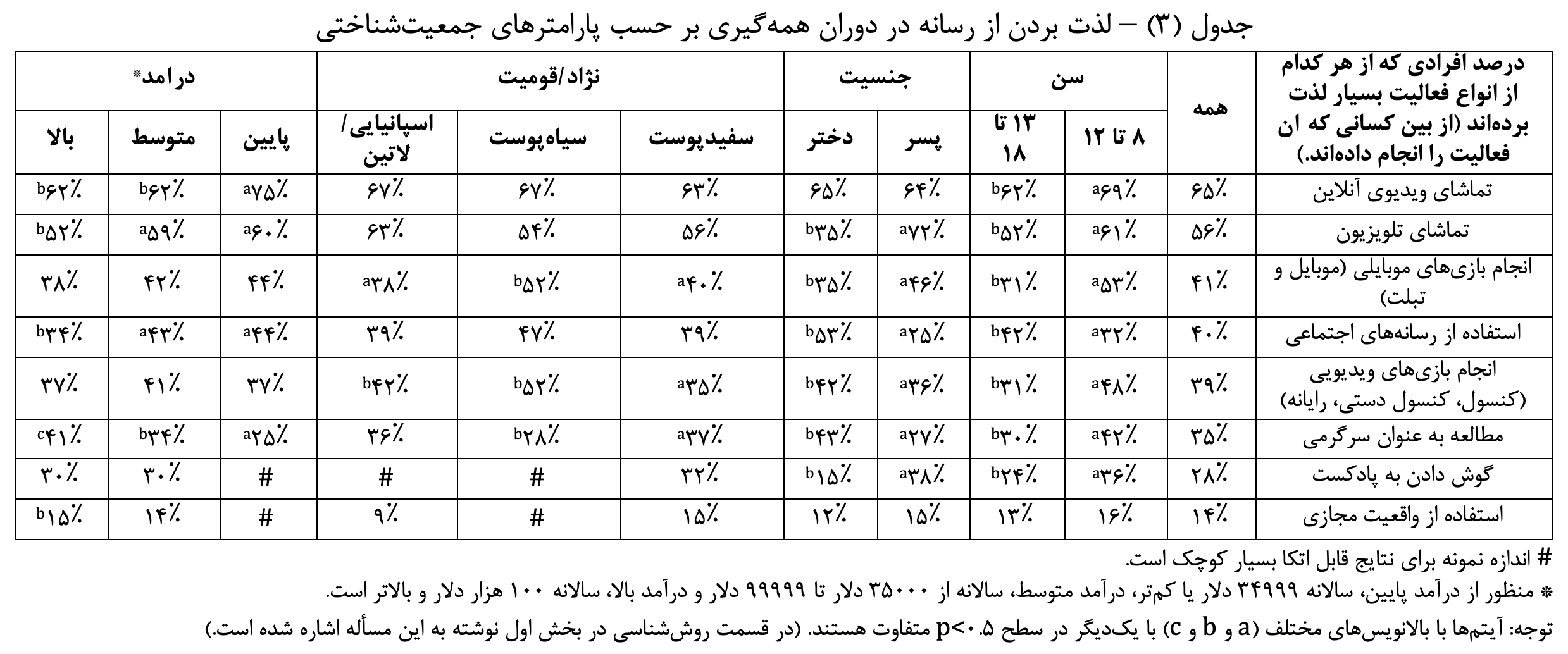 همانطور که در بالا ذکر شد، ویدیوهای آنلاین بیشترین لذت را برای کسانی که تماشا کردهاند به ارمغان میآورد، به طوری که 65 درصد از بینندگان میگویند که از آنها “بسیار” لذت میبرند (جدول 3 را ببینید). بازیهای ویدیویی نیز لذت زیادی را برای کسانی که بازی میکردند به ارمغان آورده است، به طوری که 56 درصد گفتند که از بازی کردن بسیار لذت میبرند. لذت در میان پسران بسیار بیشتر از دختران بود (72% از پسران از بازی “بسیار” لذت در بردهاند، در مقایسه با 35% از بازیکنان دختر). از سوی دیگر، دختران بیشتر از پسران از رسانههای اجتماعی و مطالعه لذت میبرند، به طوری که 53 درصد از کاربران دختر گفتند که از رسانههای اجتماعی «بسیار» لذت میبرند (دو برابر پسران با ۲۵ درصد)، و 43 درصد از دخترانی که مطالعه کردهاند، گفتند که از کتاب خواندن “بسیار” لذت بردهاند (در مقابل عدد 27٪ برای پسران). تماشای ویدیوهای آنلاین در همه طبقات بسیار محبوب بود، اما به طور خاص جوانان کم درآمد (75٪ در مقابل 62٪ از جوانان با درآمد متوسط و بالاتر) لذت بیشتری بردهاند. خواندن بیشترین لذت را برای جوانان خانوادههای با درآمد بالاتر به ارمغان آورده است، به طوری که 41 درصد از کتابخوانهای خانوادههای با درآمد بالاتر گفتند که “بسیار” از آن لذت میبرند که این عدد در خانوادههای کمدرآمد 25 درصد است.