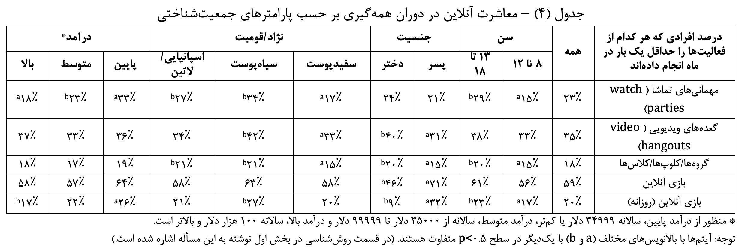 در بحث بازیهای ویدیویی تفاوت زیادی بر اساس جنسیت وجود داشت (جدول 4 را ببینید). بیش از هفت نفر از هر 10 پسر (71 درصد) حداقل یک بار در ماه بازی های ویدیویی را با دوستان خود به صورت آنلاین انجام میدهند، در حالی که این رقم در دختران 41 درصد است. به طور جزئیتر یک سوم (32 درصد) از پسران در مقایسه با 9 درصد از دختران، هر روز بازی های آنلاین انجام میدهند. دختران بیشتر از پسرها در گعدههای ویدیویی با دوستان (40 درصد دختران در مقایسه با 31 درصد پسران برای حداقل یک بار در ماه انجام این کار) و همچنین بیشتر از پسرها در کلوپهای مجازی یا کلاسهای غیرمرتبط با مدرسه به صورت آنلاین شرکت کردهاند (۲۰ درصد از دختران این کار را حداقل یک بار در ماه انجام دادهاند، در مقابل 15٪ از پسران).