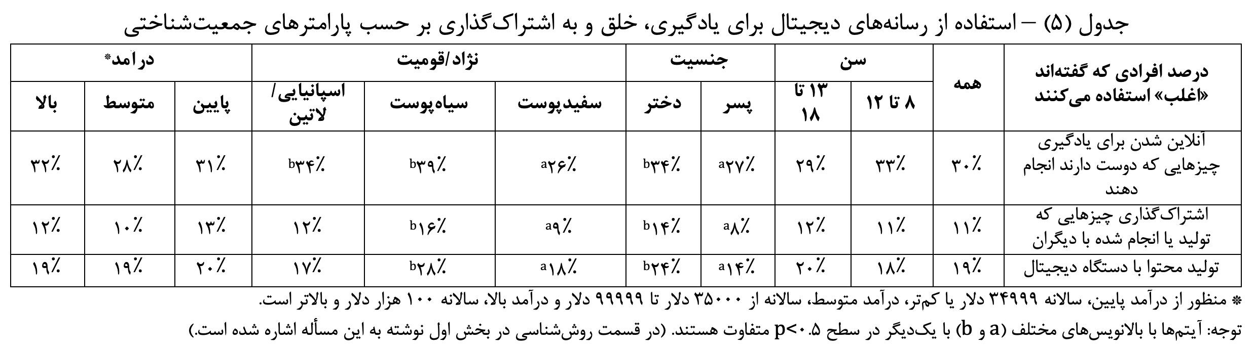 پدید آوردن. علاوه بر استفاده از اینترنت برای یادگیری نحوه پیگیری علایق خود، بسیاری از جوانان از دستگاههای خود مستقیماً برای ساختن آثار هنری یا موسیقی مانند گرفتن و ویرایش عکس، ساخت فیلم یا آهنگسازی استفاده کردهاند. حدود نیمی (53 درصد) از همه افراد 8 تا 18 ساله گفتند که این کار را انجام دادهاند و 19 درصد گفتهاند که «اغلب» این کار را انجام میدهند. مجدداً، دختران بیشتر از پسرها تمایل به ایجاد محتوای دیجیتال داشتند (24 درصد در مقابل 1۴ درصد که گفتهاند اغلب این کار را انجام میدهند)، و سیاهپوستان بیشتر از همسالان سفیدپوست یا اسپانیایی/لاتینی خود این کار را انجام می دهند (28 درصد از سیاهپوستان که اغلب این کار را انجام میدهند در مقایسه با 17 درصد از اسپانیایی/لاتینها و 18 درصد از سفیدپوستان).